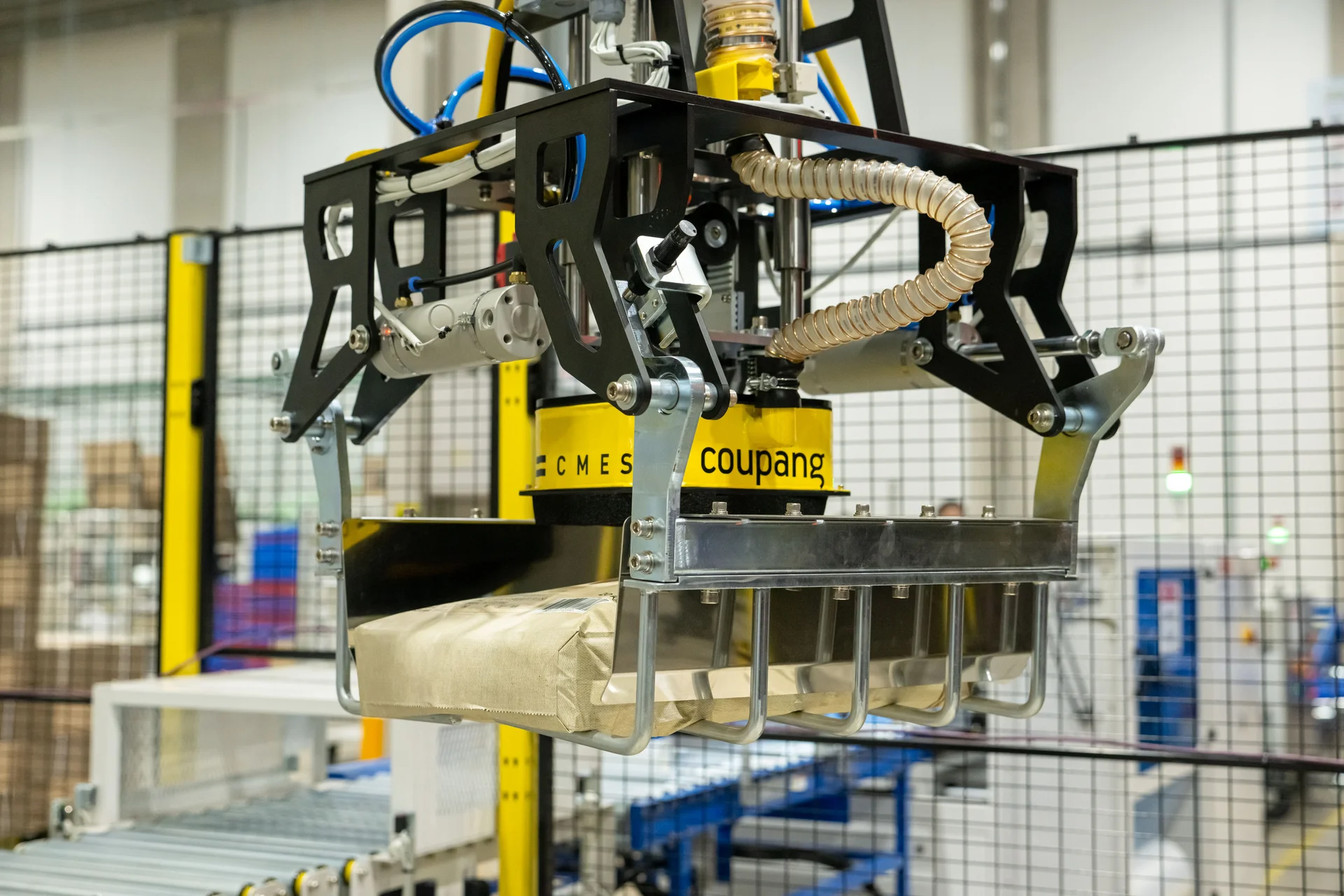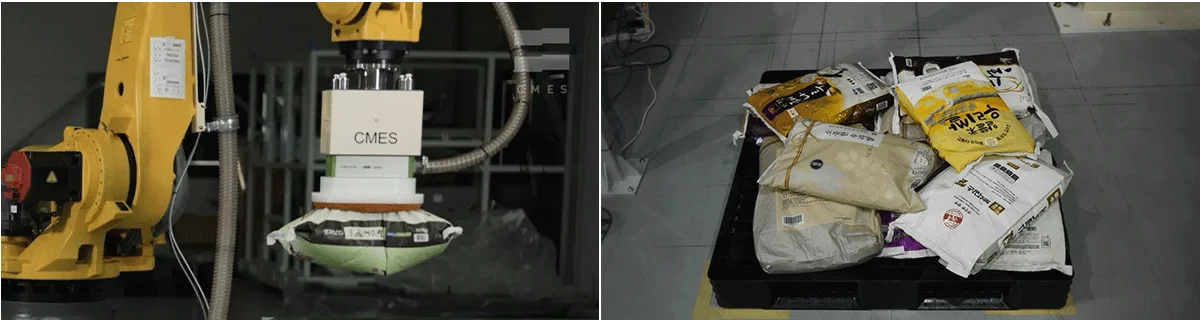쿠팡의 포대 디팔레타이징 설비를 개발하면서 씨메스는 기존의 다양한 양산 그리퍼들을 테스트하였고, 최종적으로 자체 그리퍼를 설계 제작하여 적용하였다. 흡착과 기계적 그리퍼를 혼합하여 설계하였는데 안정적인 파지와 빠른 작업 속도를 가능하게 해주며, 작업 중 외부 요인으로 시스템이 정지되더라도 작업물을 안전하게 유지할 수 있습니다. 또한, 기울어지거나 흐트러진 상태의 포대도 안정적으로 작업할 수 있도록 능동적인 그리퍼 자세 제어가 가능합니다.