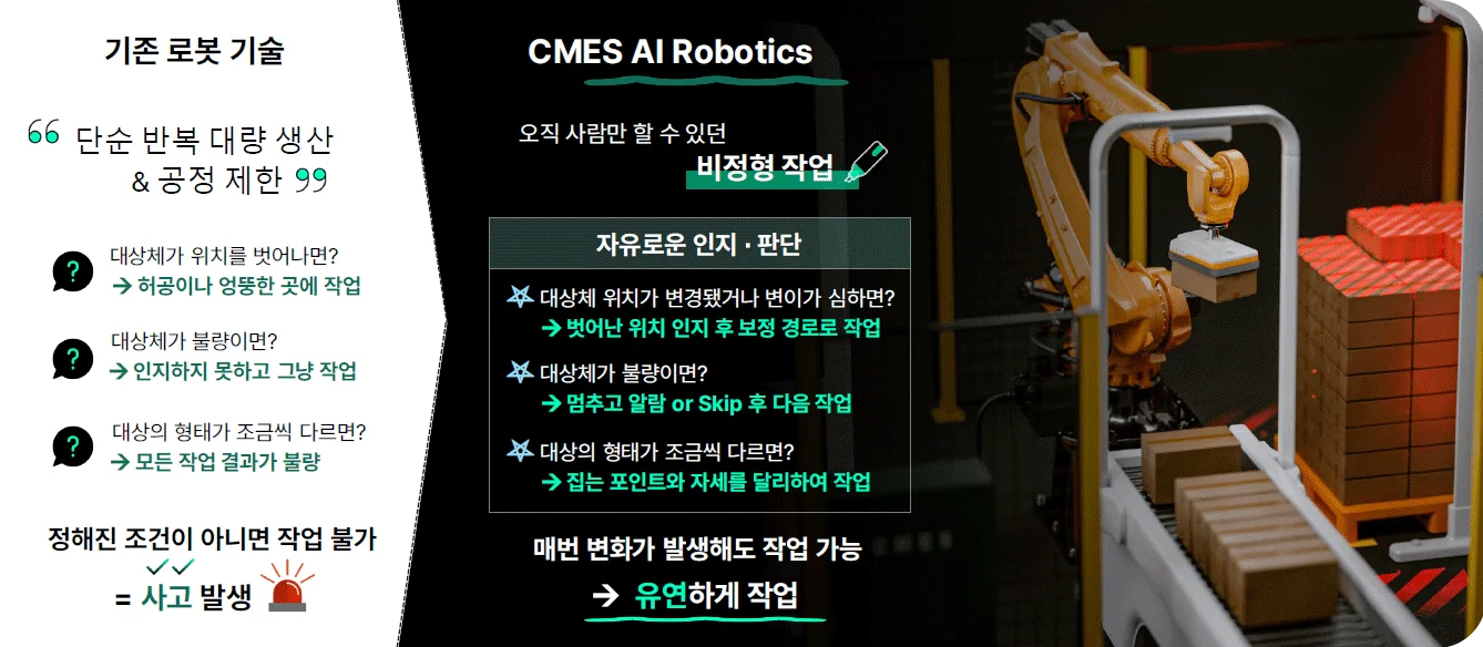 기존 자동화가 단순 반복이나 정형화된 작업에만 머물렀다면, 씨메스 AI 로보틱스는 ‘사람만 할 수 있다’ 여겨졌던 비정형 작업까지 자동화의 영역으로 확장합니다.