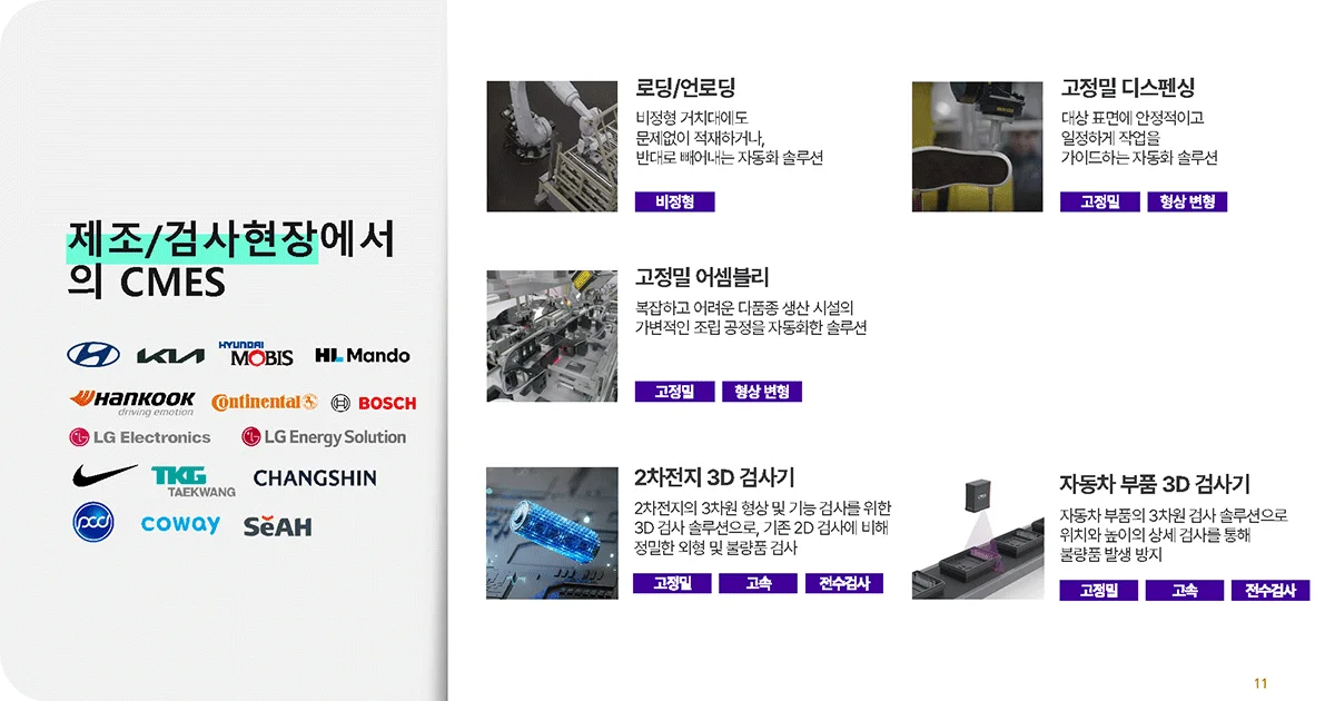 복잡한 형상의 부품을 정확하게 적재하거나 분리하거나, 소재 표면을 정밀하게 분석해 균일한 작업을 하는 작업, 그리고 조건이 수시로 변경되는 큰 조립 공정까지도 자동화를 구현하고 있습니다.