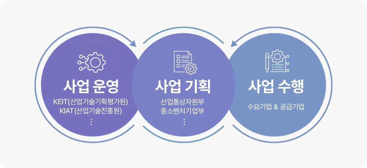 사업 기획 (중앙 부처/지방 정부): 산업통상자원부나 중소벤처기업부 등 정부 부처에서 국가 전략을 수립하고 예산을 배정하여 사업의 큰 그림을 그립니다.